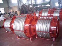 該膨脹節(jié)的二端各有一個工作波紋管,中間有一個平衡波紋管,膨脹節(jié)通過受力構件(大拉桿或舌管)來承受內壓推力,因此管系只需中間固定支架。該膨脹節(jié)只能吸收軸向位移。