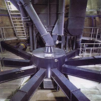 均化庫(kù)庫(kù)頂布料一般選用圓柱形生料分配器,該分配器充氣室用兩層滌綸纖維作充氣材料,以中壓離心鼓風(fēng)機(jī)供氣。經(jīng)流態(tài)化的生料由生料分配器通過(guò)斜槽多點(diǎn)均勻入庫(kù)。
