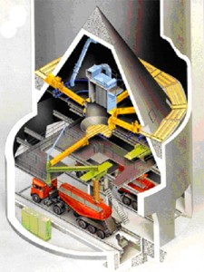 IBAU均化庫采用德國漢堡公司的連續(xù)均化技術。在外部帶一攪拌倉,庫底中心設一大圓錐,庫內生料的重量通過該錐傳遞給庫壁,庫底環(huán)形空間被分成向中心傾斜10度的6個充氣區(qū),每區(qū)裝設3種規(guī)格的6個充氣箱。充氣卸料時生料先被送至一條徑向布置的充氣箱上,再經(jīng)過錐體下部的出料口由空氣斜槽送入庫底中央4000mm計量倉中。卸料時,生料在自上而下的流動過程中,切割水平料層而產(chǎn)生重力混合 作用,進入攪拌倉后又連續(xù)充氣攪拌而得到進一步均化,均化效果H可達6~8,電耗0.1~0.2Kwh/t生料。
